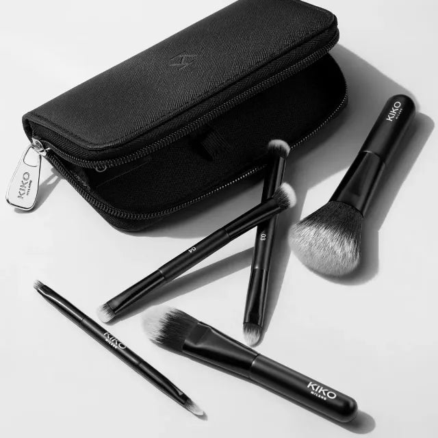 Pratica pochette dal design elegante completa di 5 accessori professionali: 2 pennelli mono e 3 pennelli duo per un totale di 8 diversi applicatori dedicati al make up viso, occhi e labbra.